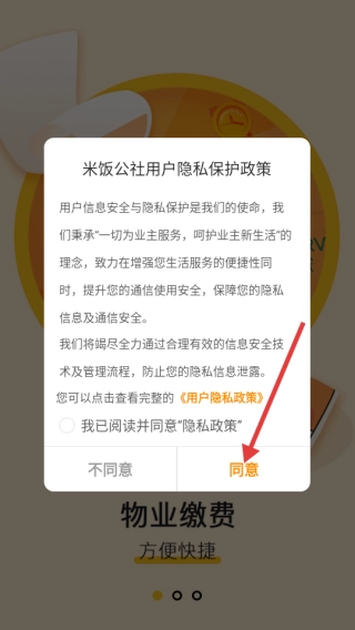 1、在米饭公社的用户隐私保护政策页面,点击【同意】按钮,即可进入软件的使用流程。