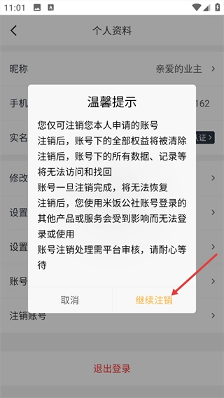 4、页面弹出温馨提示,确认后可点击【继续注销】提交账号注销申请。