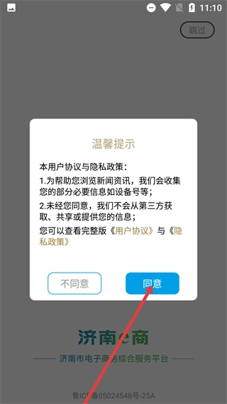 1、仔细阅读《用户协议》和《隐私政策》的具体内容,在确认无误后点击“同意”按钮,即可进入济南市电子商务公共服务平台的操作界面。