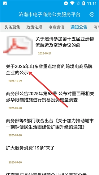 3、在【通知公告】列表页,选择【关于2025年山东省重点培育的跨境电商品牌企业的公示】并点击,进入公告详情页。