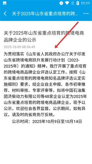 4、在公告详情页,查看该公示的具体内容,了解认定企业、公示时间等2025年山东跨境电商品牌培育相关信息。