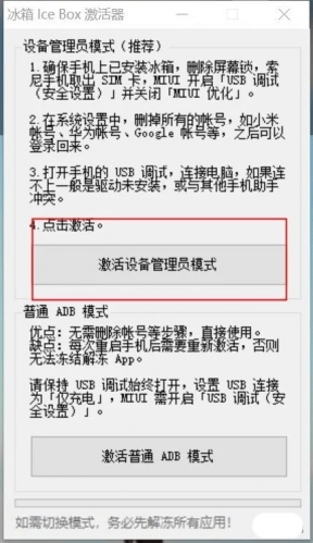 4、然后冰箱并打开选到设备管理员模式,并点击一键激活工具