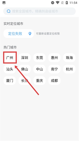 2、在城市选择界面,可通过搜索或选择热门城市(如示例中的【广州】),选定目标城市以查看对应地区的天气信息。