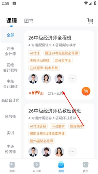 1、在斯尔题库首页,点击底部的商城选项,进入课程商城页面。