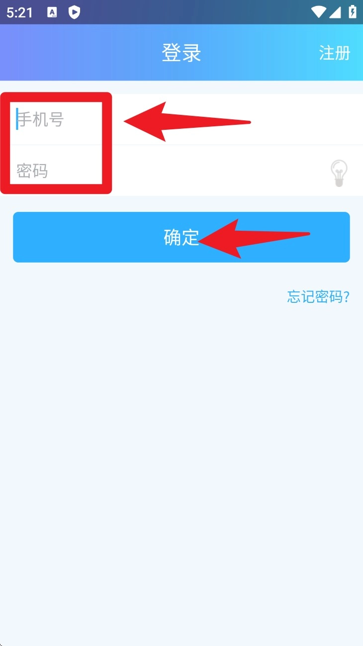 2. 注册完成后返回登录页,输入手机号与密码后点击确定按钮,即可成功登录。