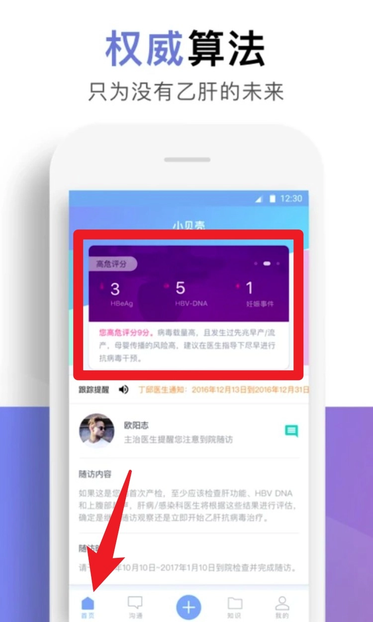3. 登录后进入首页可查看乙肝高危评分详情,包括抗原状态、病毒量和妊娠事件,辅助评估风险等级。