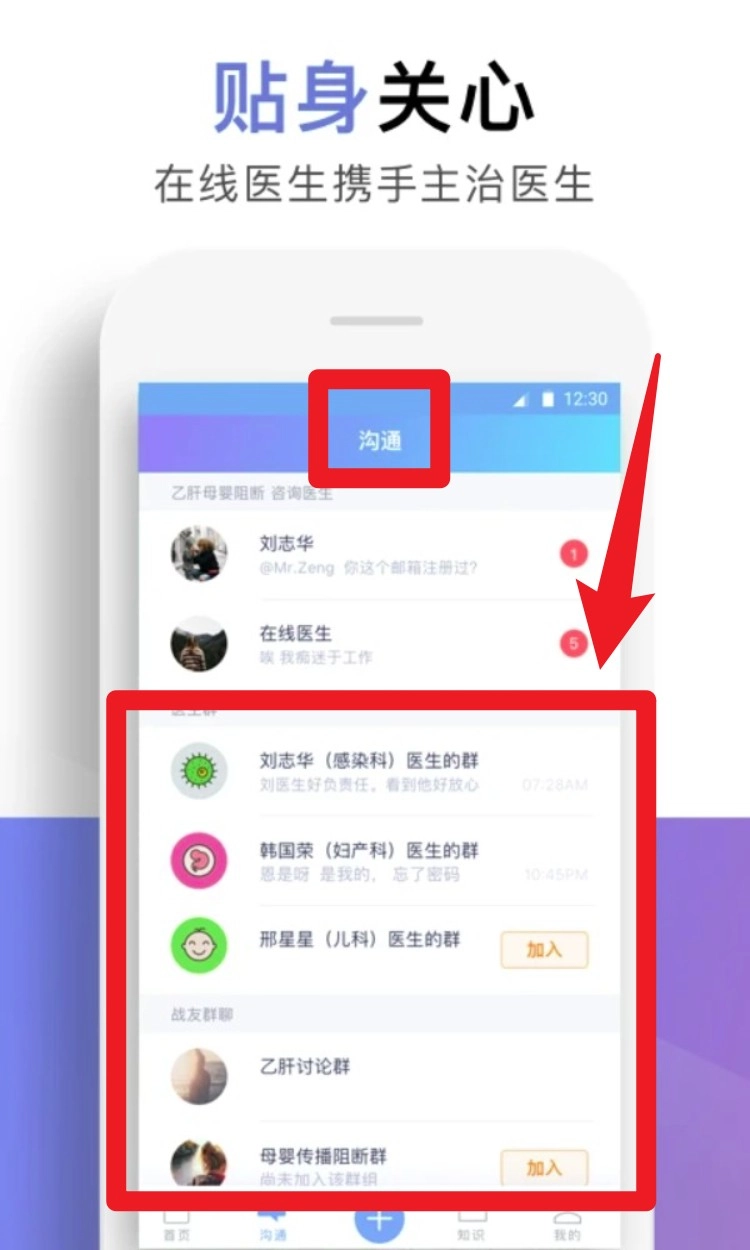 4. 点击底部沟通菜单可进入医生群聊区,支持加入感染科、产科、儿科等群组,在线与医生实时互动。