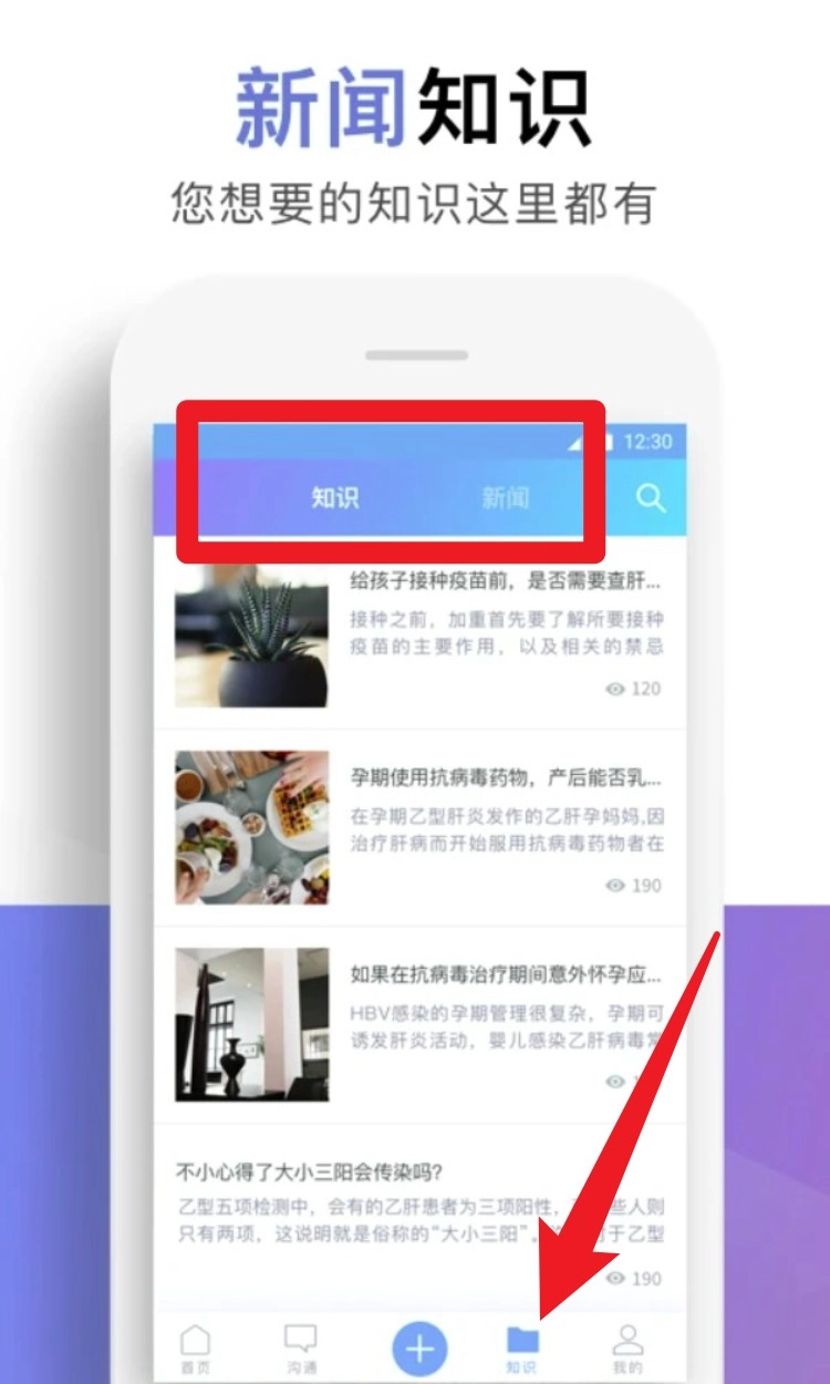 5. 在底部点击知识栏目,可浏览乙肝科普内容及孕期相关资讯,涵盖治疗方案、疫苗接种等实用话题。