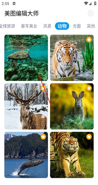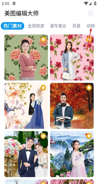 1、启动美图编辑大师并进入首页,浏览热门素材的分类标签,选择动物标签以切换至相应的素材列表。