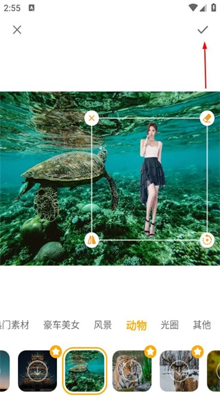 4、进入素材编辑界面,将模特图与海龟素材进行合成编辑,调整完成后点击右上角确认按钮。