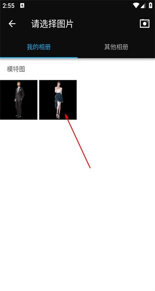 3、在图片选择页,查看我的相册里的模特图,选择对应的模特图片进入素材编辑界面。